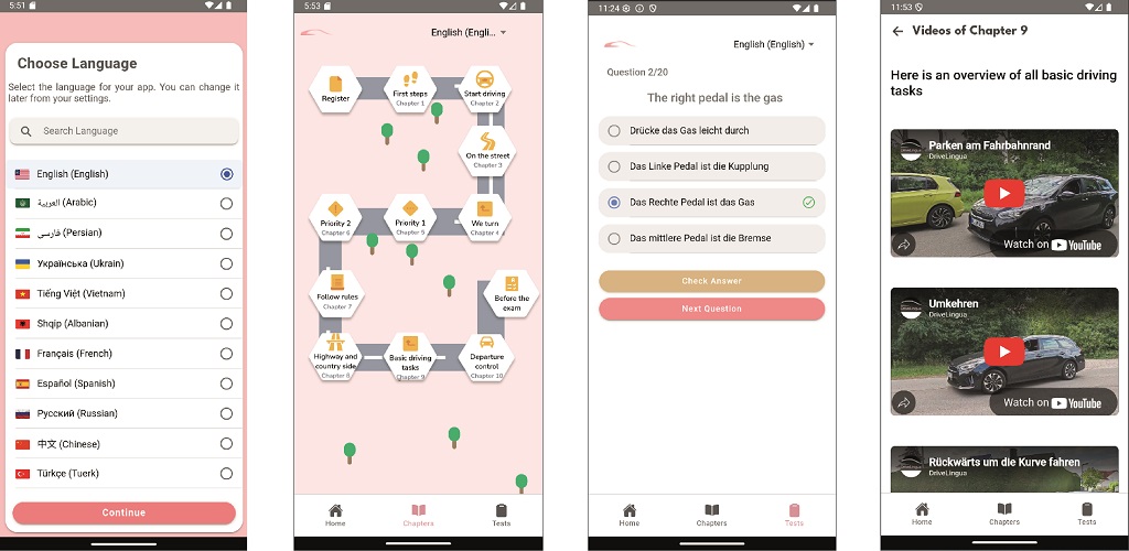 Pasi të keni përfunduar një kapitull, testoni njohuritë tuaja me ndihmën e ushtrimeve të përfshira. Përsërisni përmbajtjen derisa ta zotëroni plotësisht – ky është çelësi i suksesit të qëndrueshëm në mësim. Me këtë kombinim leximi, dëgjimi, shikimi dhe praktikimi, Drivelingua ju përgatit jo vetëm për orët e drejtimit, por edhe për provimin.